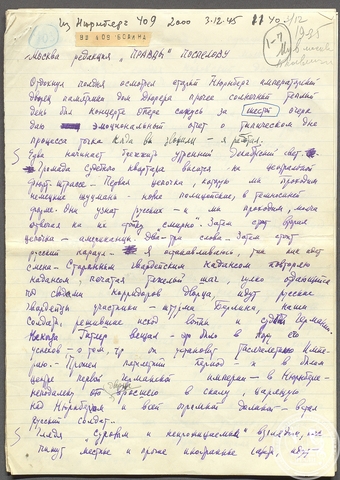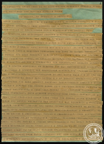 Человек исключительной энергии и работоспособности, Всеволод Вишневский, вероятно, стал главным советским трибуном на Нюрнбергском процессе, написав о нем более двадцати очерков. Большая часть из них – как в виде рукописей, так и в виде вырезок из газет – сохранилась в его личном фонде № 1038 в РГАЛИ. Первая его корреспонденция «На процессе в Нюрнберге» была опубликована в «Правде» через несколько дней после первого заседания, 26 ноября 1945 года. «Пишу быстро, с подъемом», – отмечал Вишневский в дневнике в тот же день.