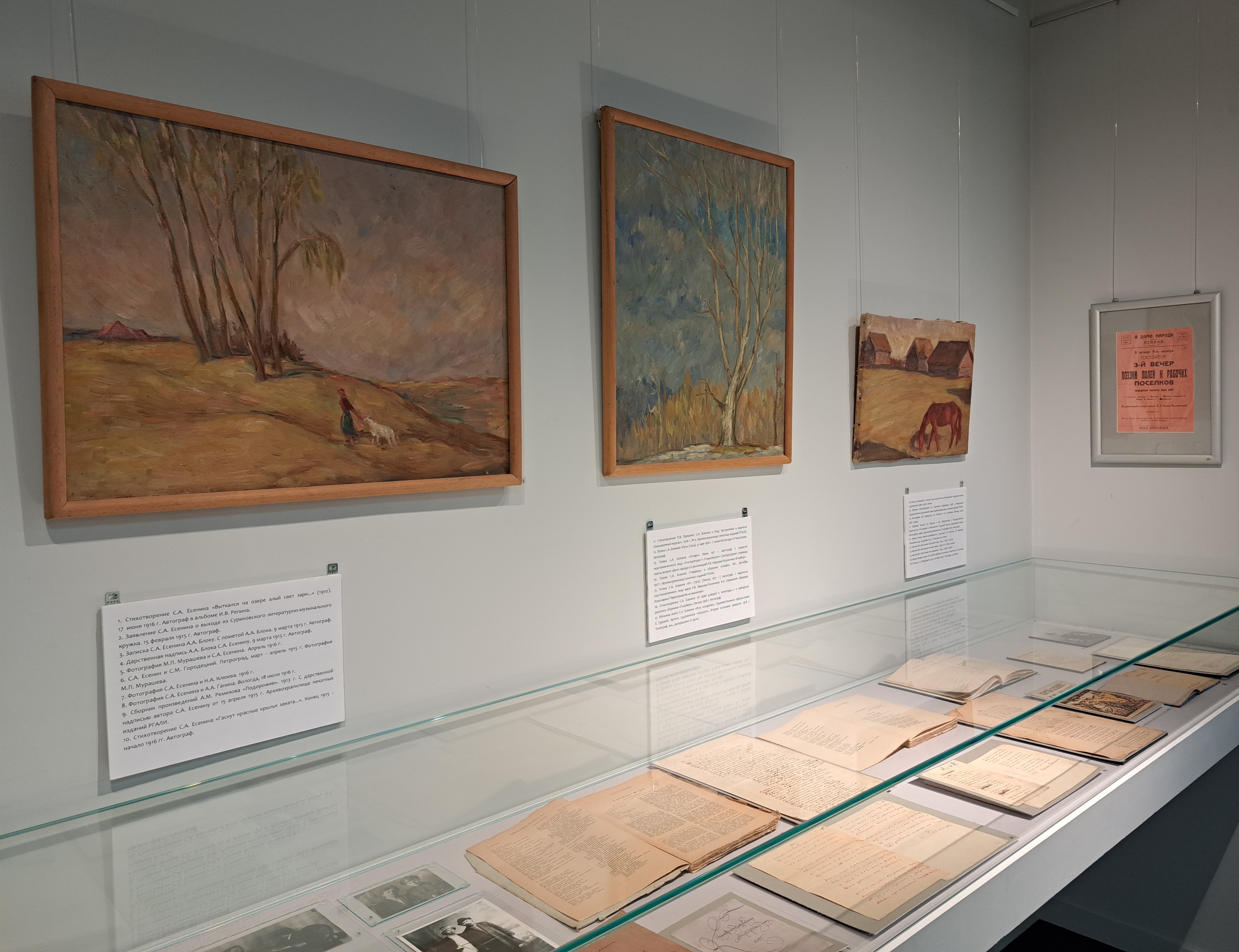 Личный фонд С.А. Есенина в РГАЛИ представляет собой одно из крупнейших и уникальных по своей полноте собраний документов поэта в России, и насчитывает более 450 единиц хранения – значительная их часть вошла в состав экспозиции. В выставочных витринах представлено около 200 документов из фондов РГАЛИ – рукописи, письма, фотографии, афиши, живопись и графика ХХ века. Выставка освещает путь С.А. Есенина в литературе, отразив эволюцию его духовных и эстетических поисков, смену настроений, мотивов, муз и главных тем. Положенные в ее основу документы позволяют в полной мере реконструировать личную и творческую биографию Сергея Есенина, чей образ в массовом сознании в значительной мере мифологизирован. Украшением выставки стали автографы его основных произведений, а также библиографические редкости — сборники поэта, выпущенные издательством «Имажинисты».
