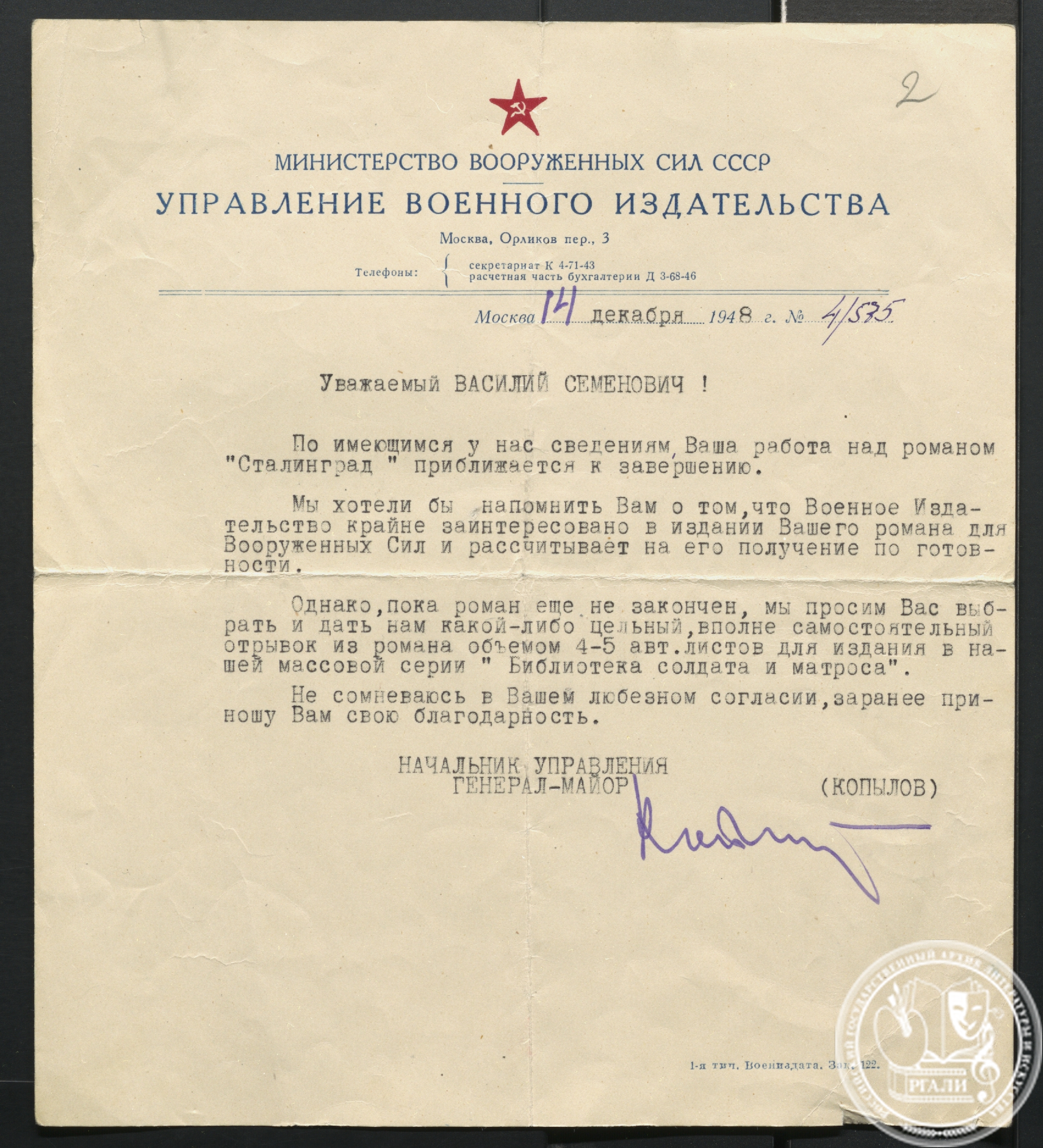 • Письмо редакции Воениздата В.С. Гроссману. 14 декабря 1948 г. РГАЛИ. Ф. 1710. Оп. 1. Подлинник.