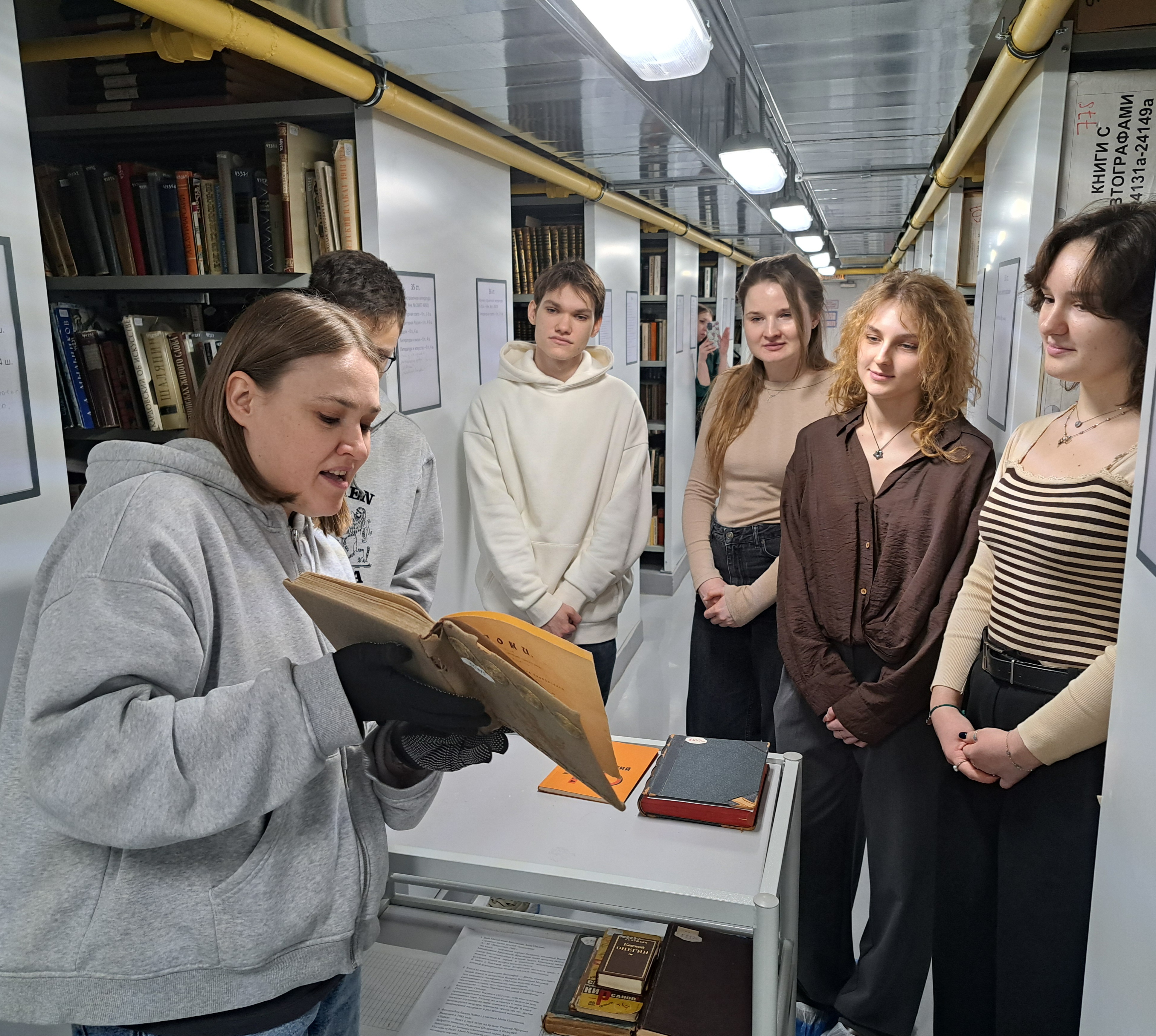 В хранилище печатных изданий студентам рассказали о составе коллекций архивохранилища и познакомили с некоторыми интересными книжными экземплярами — грамматикой начала XVIII века, примерами книжного авангарда, изданиями из личных собраний фондообразователей архива, такими как том рассказов А.М. Ремизова с его автографом на глаголице. Затем бакалавры познакомились с традиционным каталогом РГАЛИ.