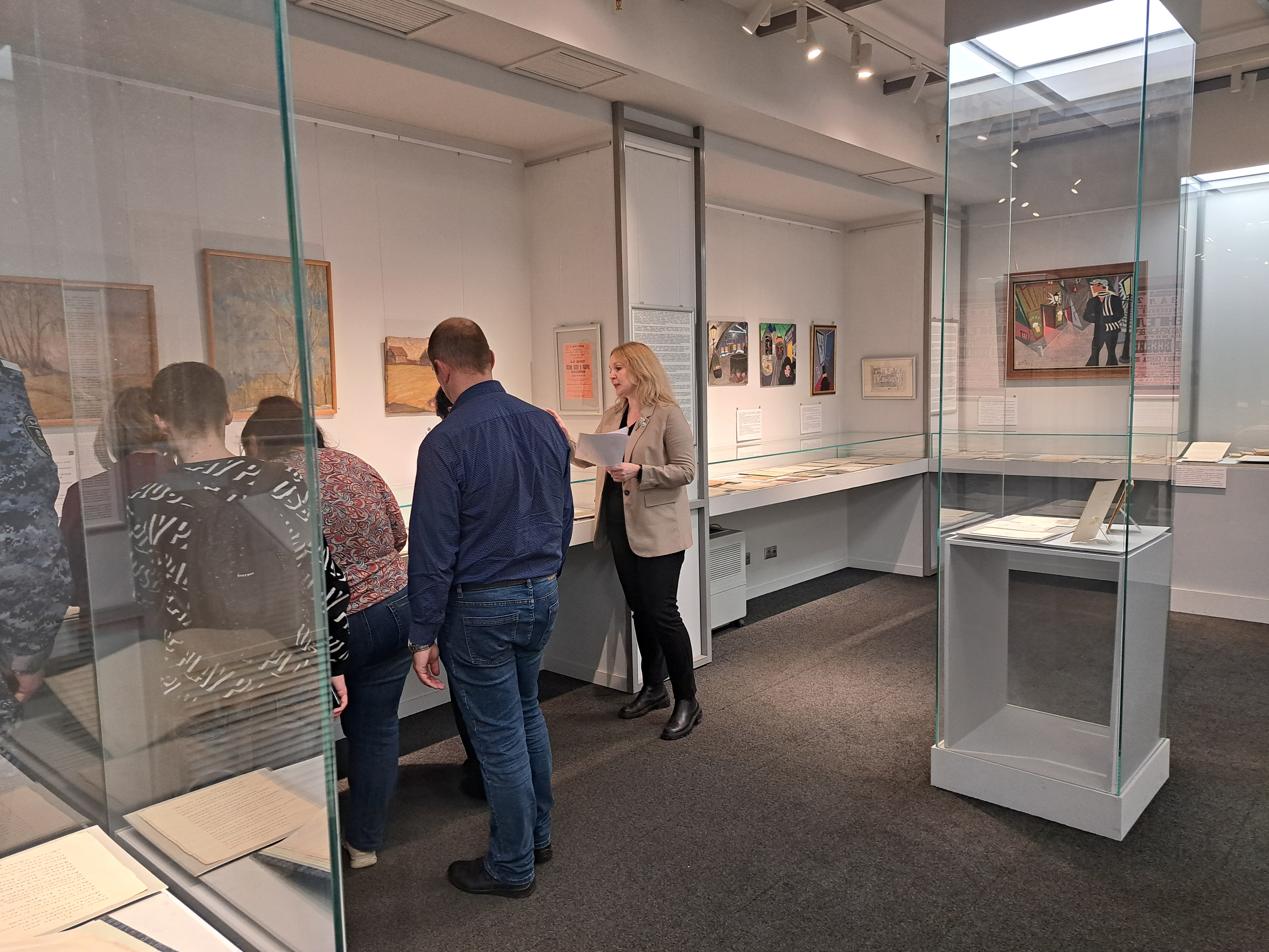 Кураторскую экскурсию по выставке провела начальник отдела К.В. Яковлева, рассказав об экспозиции, построенной на подлинных архивных материалах и призванной продемонстрировать путь С.А. Есенина в литературе, отразив эволюцию его духовных и эстетических поисков, смену настроений, мотивов, муз и главных тем. Положенные в ее основу документы позволяют в полной мере реконструировать личную и творческую биографию Сергея Есенина.