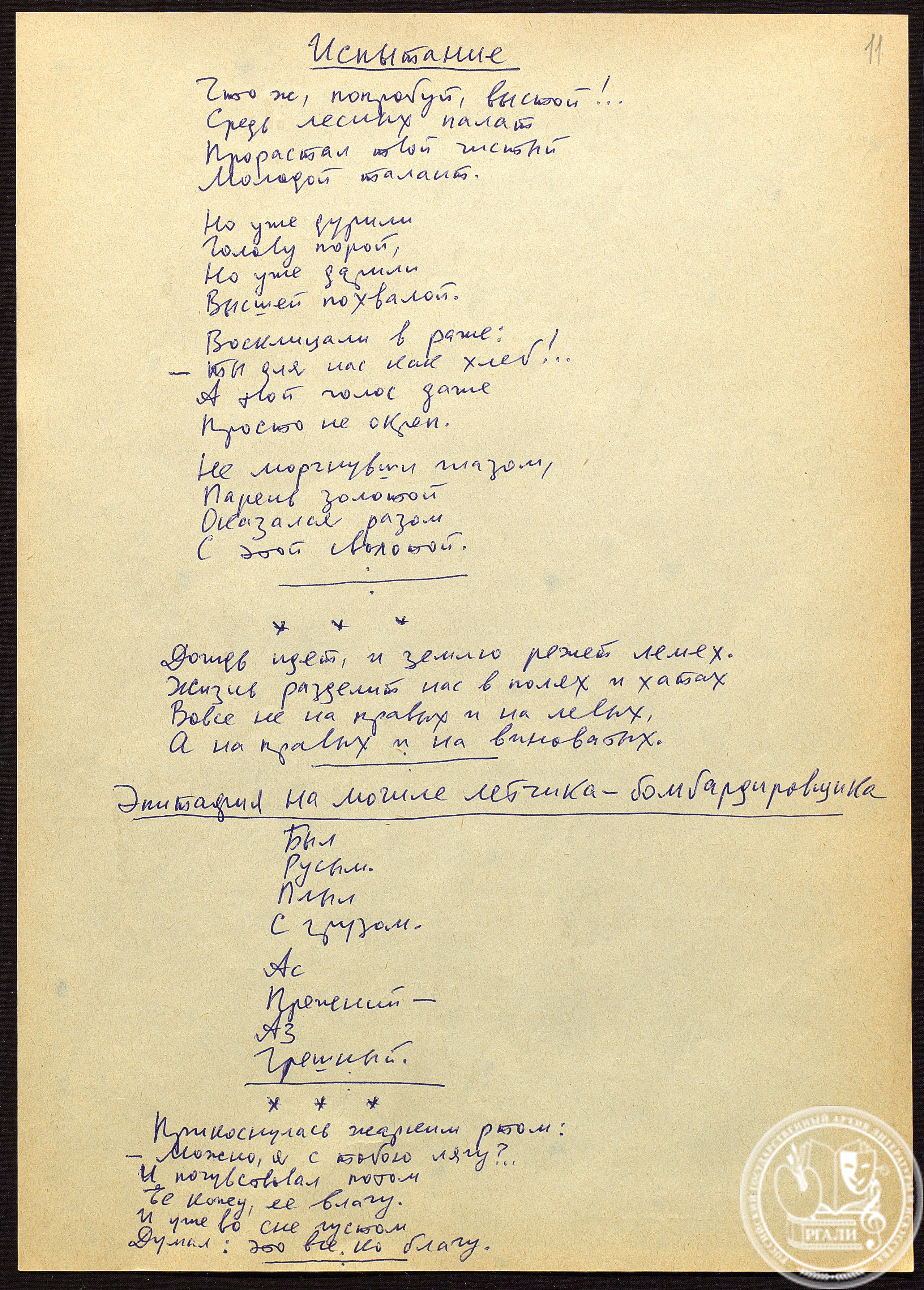 • Стихотворения К.Я. Ваншенкина «Испытание», «Дождь идет, и землю режет лемех…», «Эпитафия на могиле летчика-бомбардировщика». РГАЛИ. Ф.3449. Оп.1. Автограф.