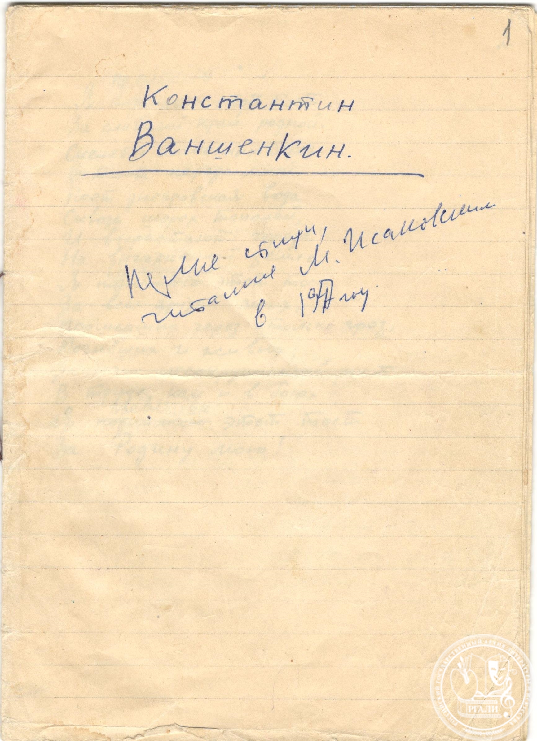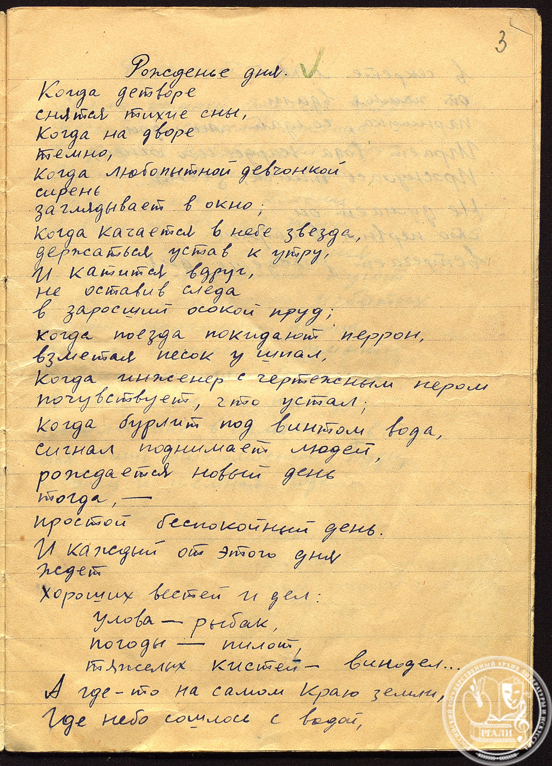 • Стихотворение «Рождение дня» в тетради, с пометкой Ваншенкина на 1-м листе. Не ранее 1945 г. РГАЛИ. Ф.3449. Оп.1. Автограф.