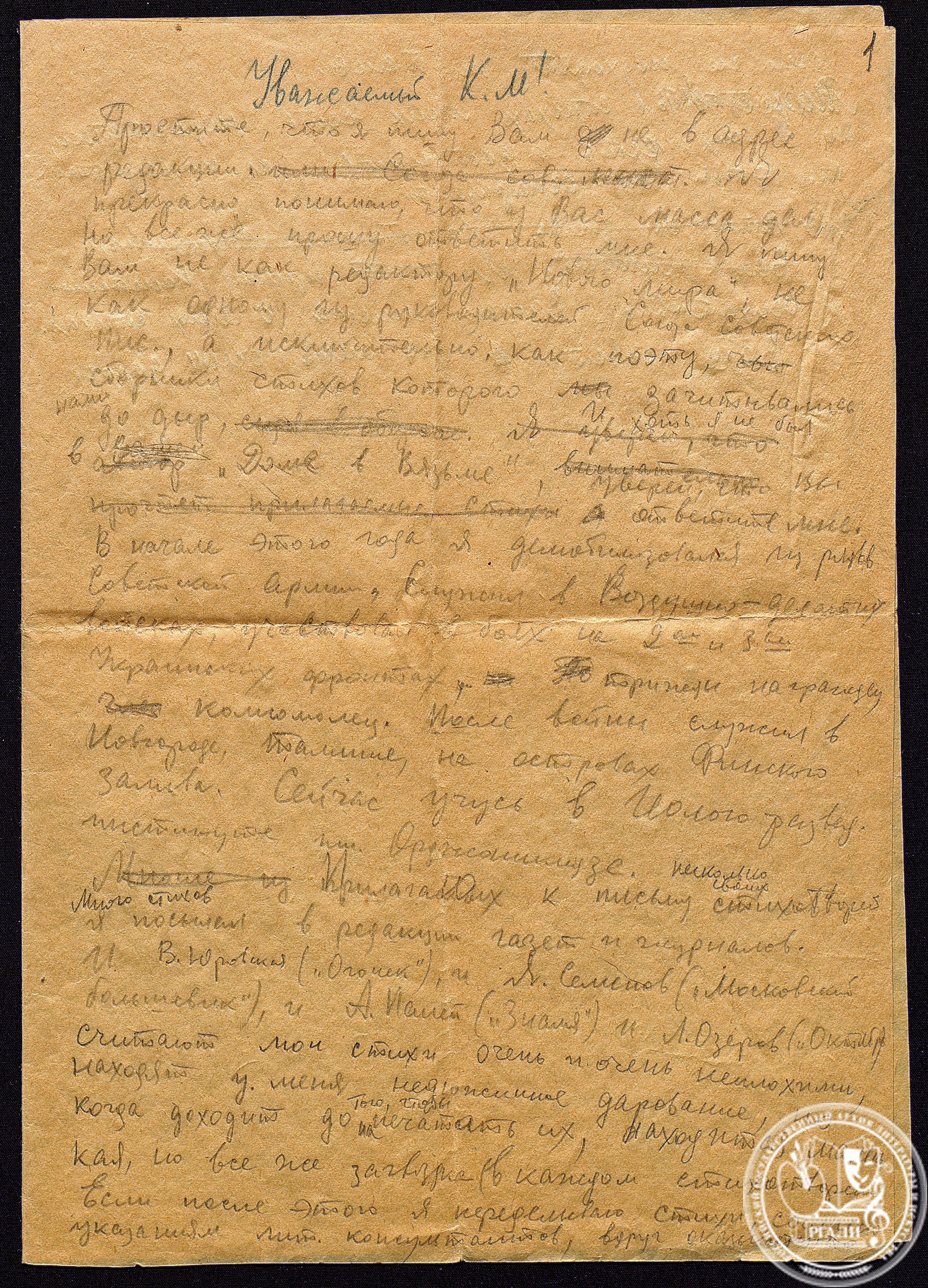 • Черновик письма К.Я. Ваншенкина К.М. Симонову. Не позднее 1948 г. РГАЛИ. Ф.3449. Оп.1. Автограф.