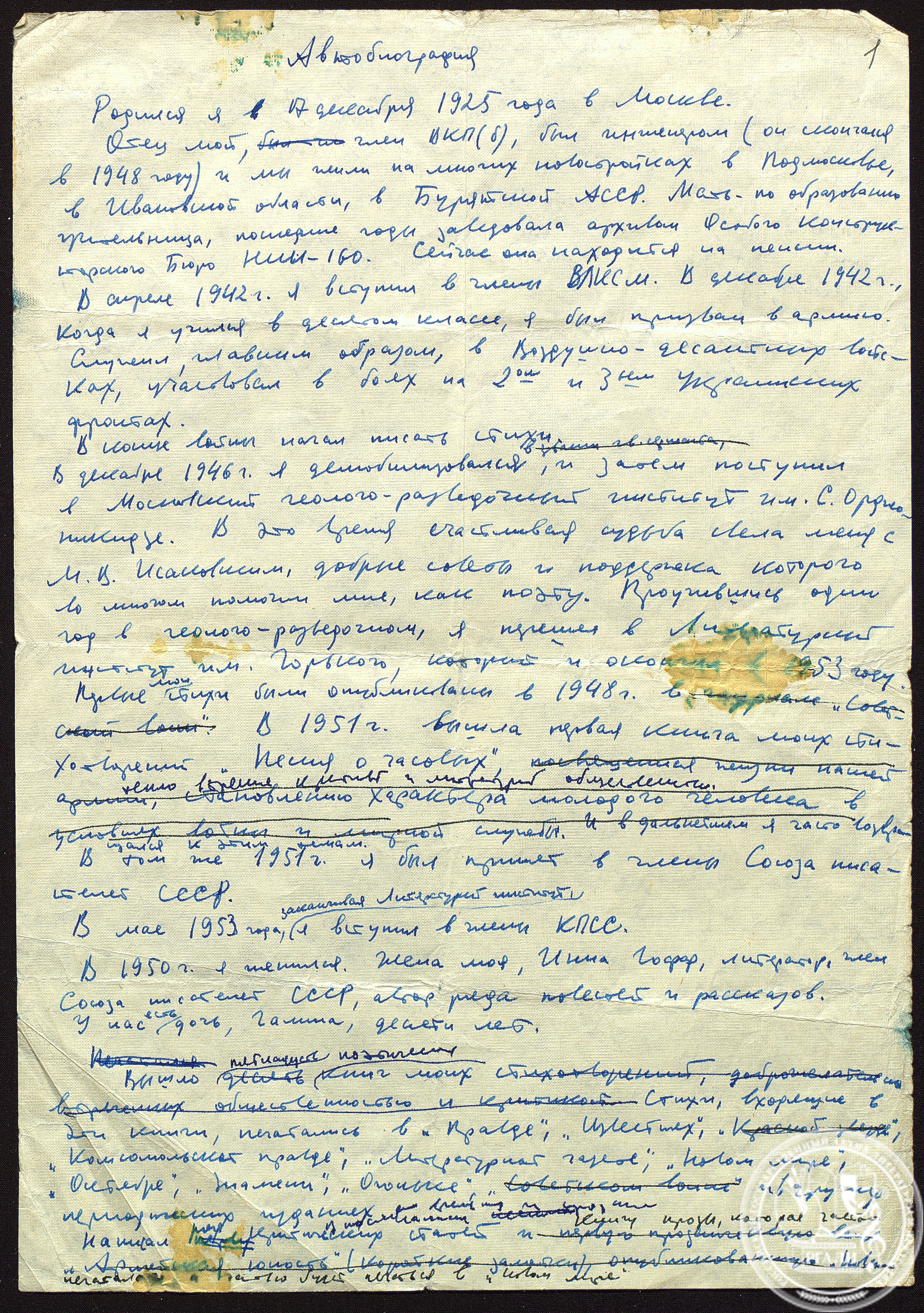 • Автобиография К.Я. Ваншенкина. [1960-е гг.] РГАЛИ. Ф.3449. Оп.1.