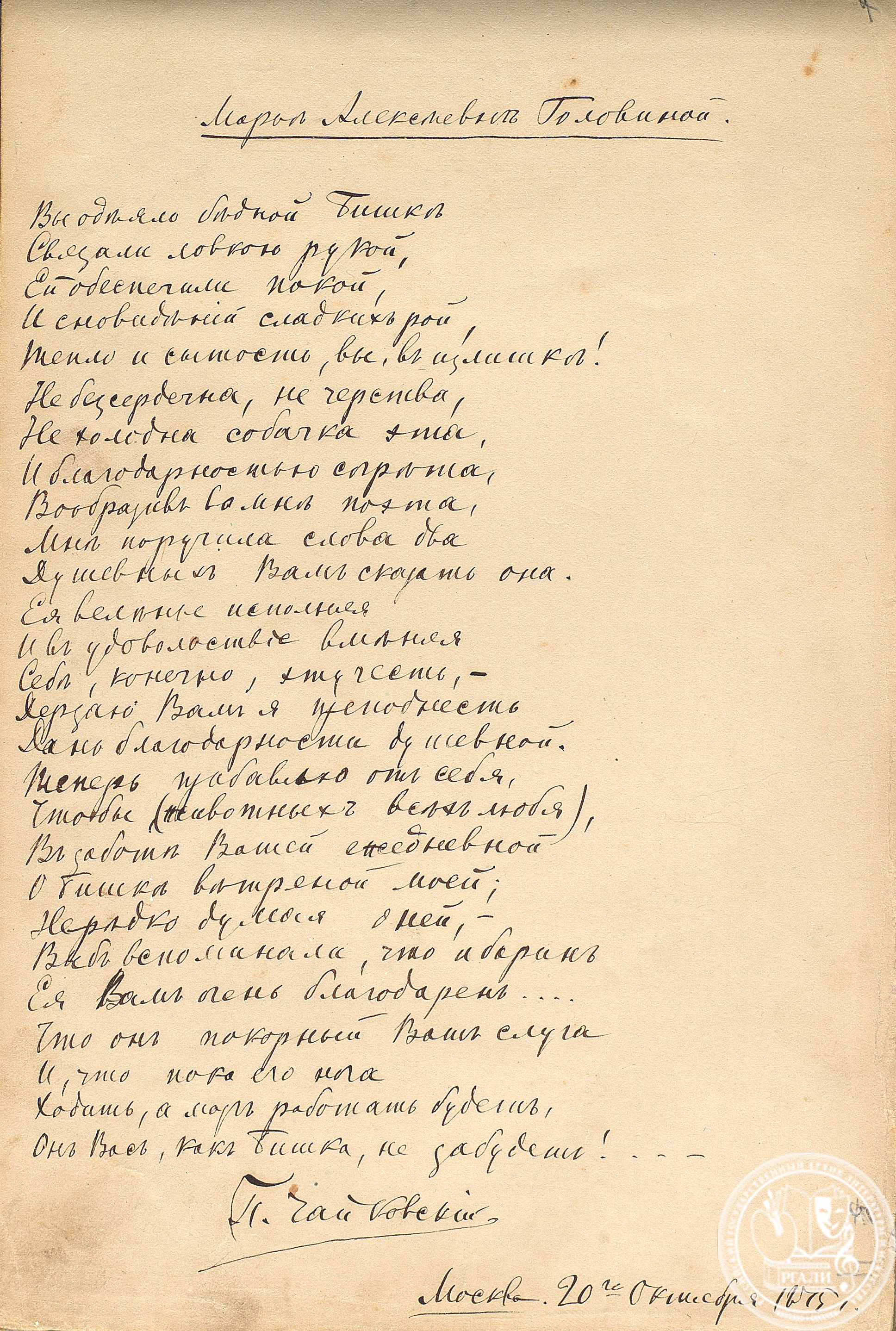 Для экспозиции архив предоставил копию стихотворения П.И. Чайковского из альбома М.А. Головиной, хранящегося в Коллекции альбомов деятелей искусств (Ф. 1949), посвященное любимой собаке композитора Бишке.