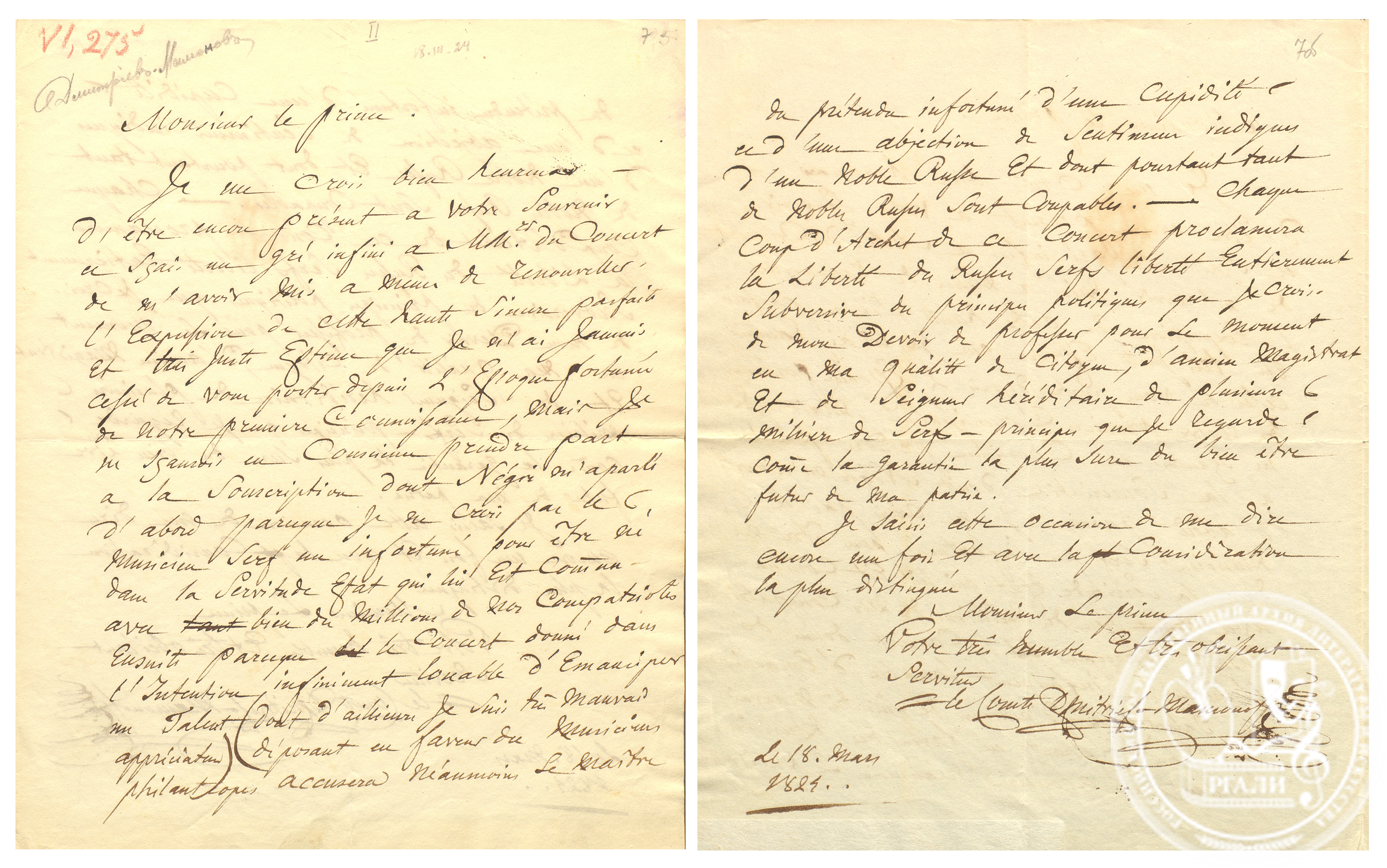 Архив предоставил 14 подлинных и документов и более 50 копий из фонда Остафьевского архива (Ф. 195), а также копии акварелей Н.А. Бестужева с видами Читы и Петровского Завода из альбома А.И. Давыдовой «Сибирь», хранящегося в Коллекции альбомов деятелей искусств (Ф. 1949). Среди документов автографы П.А. Вяземского и Н.М. Карамзина, подлинные письма М.А. Дмитриева-Мамонова, М.Ф. Орлова, С.Г. Волконского, К.А. Охотников, Н.Д. Шаховской и М.Н. Волконской князю и другие материалы.
