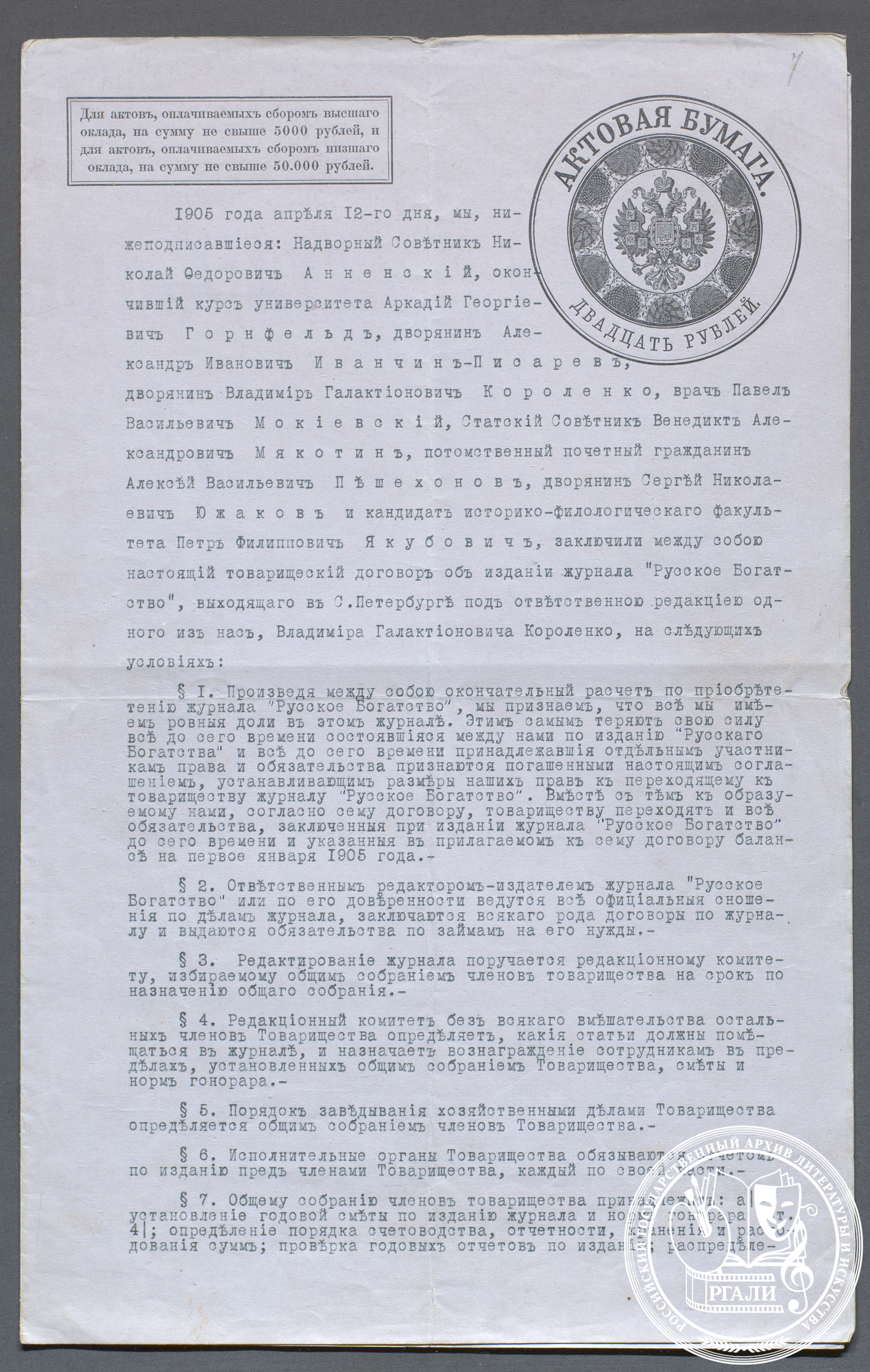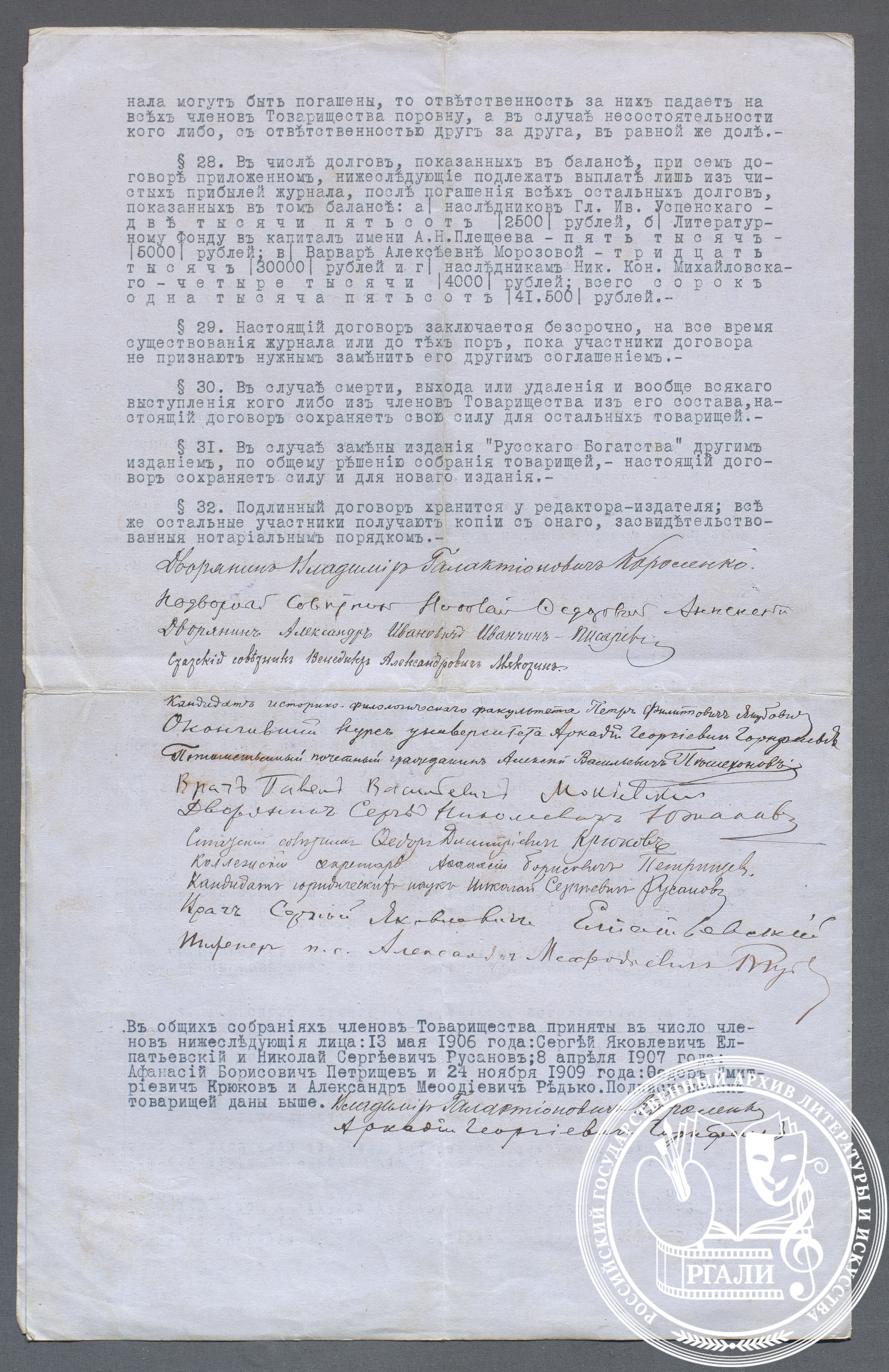 Основным хранителем документального наследия «Русского богатства» является Рукописный отдел ИРЛИ. Однако и в РГАЛИ имеется небольшой фонд «Русского богатства» под № 1668, содержащий 19 единиц. Среди них особого внимания заслуживает один из вариантов того самого «товарищеского договора». Вариант этого же текста сохранился в одном из личных фондов РГАЛИ – среди материалов редактора журнала Аркадия Георгиевича Горнфельда (ф. 155).