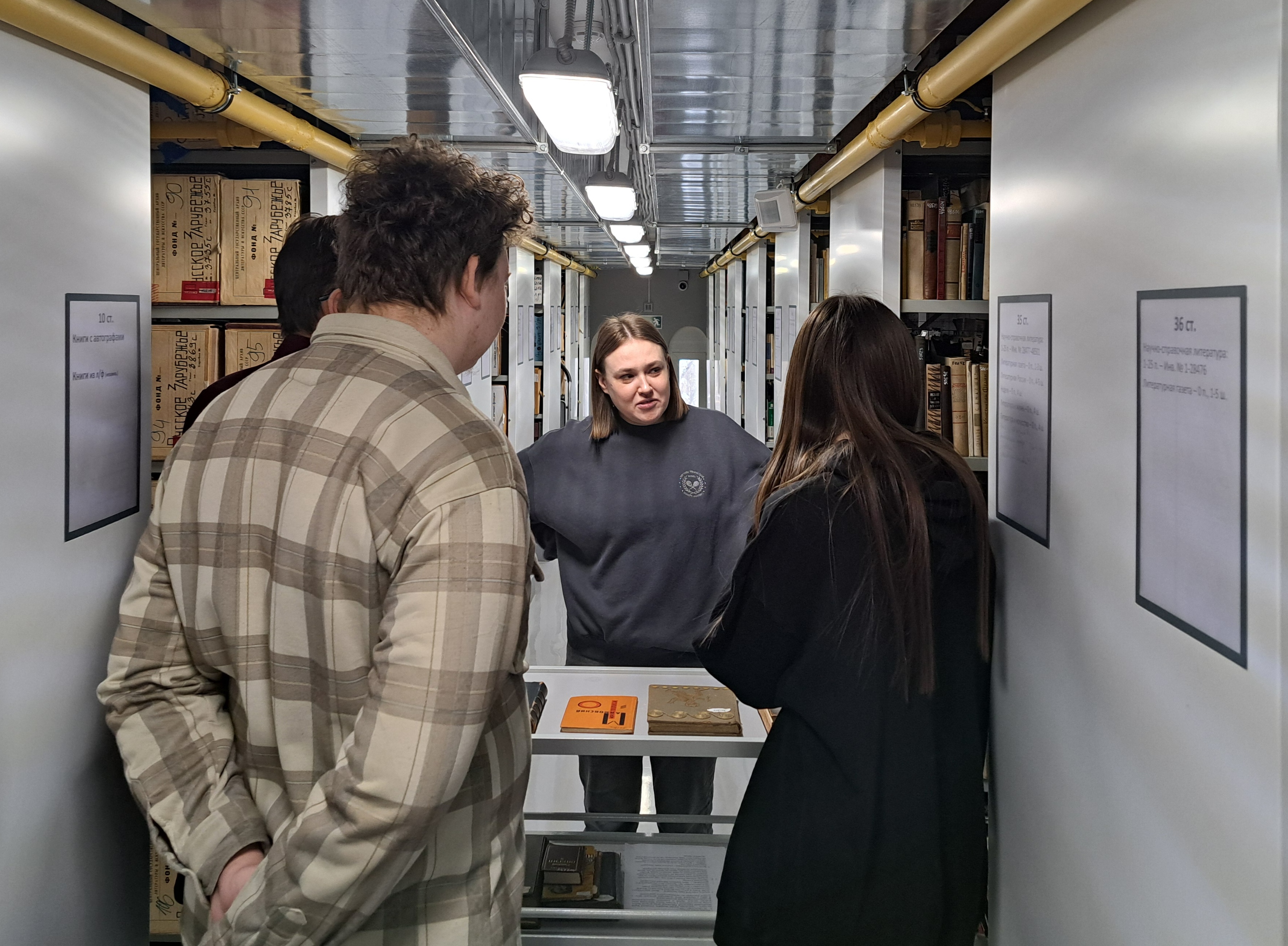 В хранилище печатных изданий практикантам рассказали о составе коллекций архивохранилища и представили некоторые интересные книжные экземпляры — Грамматику начала XVIII века, примеры книжного авангарда в изданиях из личных собраний фондообразователей архива, — такие как том рассказов А.М. Ремизова с его автографом на глаголице.