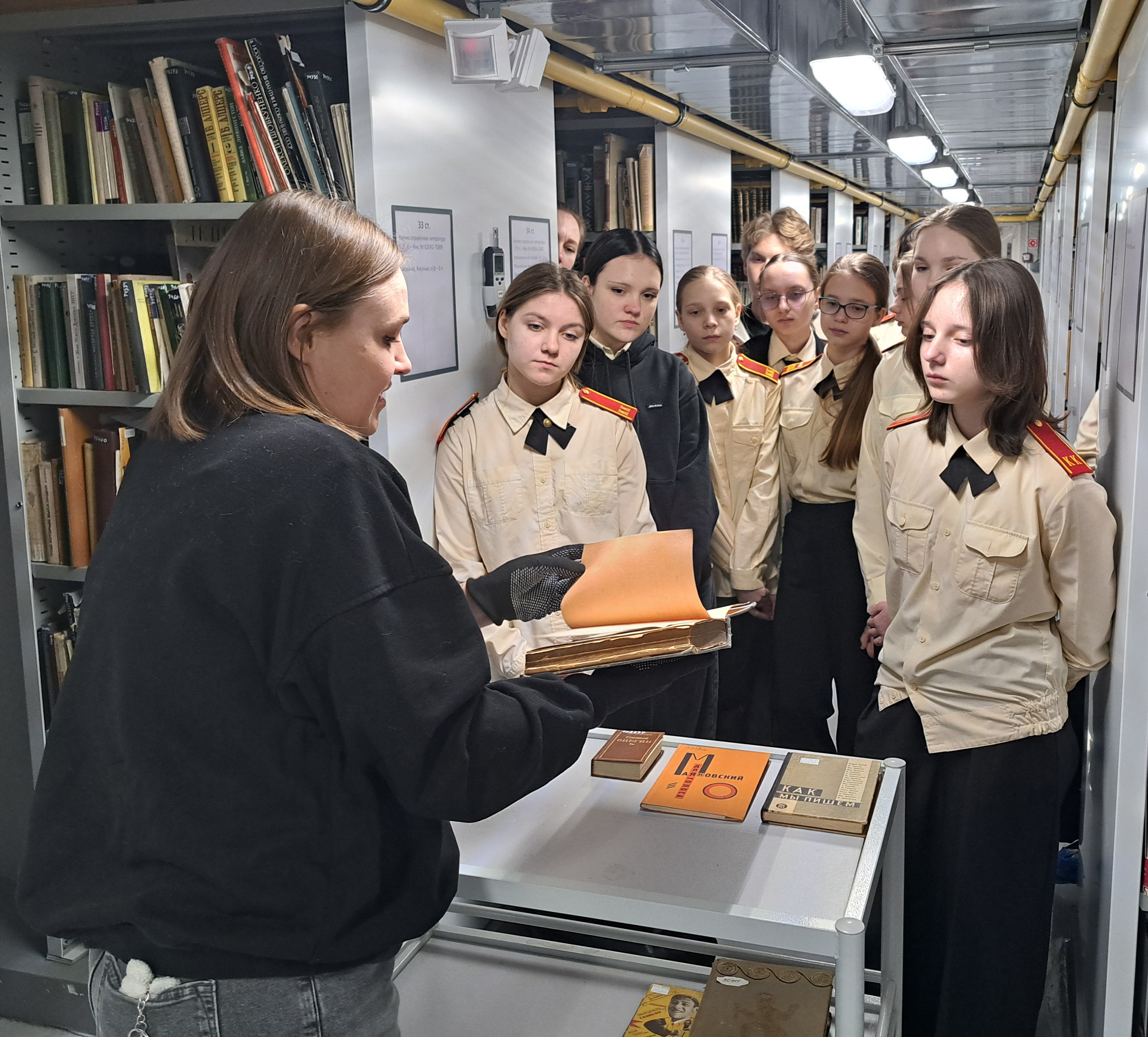 Далее учащиеся посетили архивохранилище печатных изданий, где заведующая архивохранилищем М.В. Шуплецова представила факсимильное издание «Евгения Онегина» А.С. Пушкина 1837 года, том сочинений М.Ю. Лермонтова 1871 года с копией автографа его стихотворения, известный сборник очерков советских писателей «Как мы пишем» 1930 года и др.