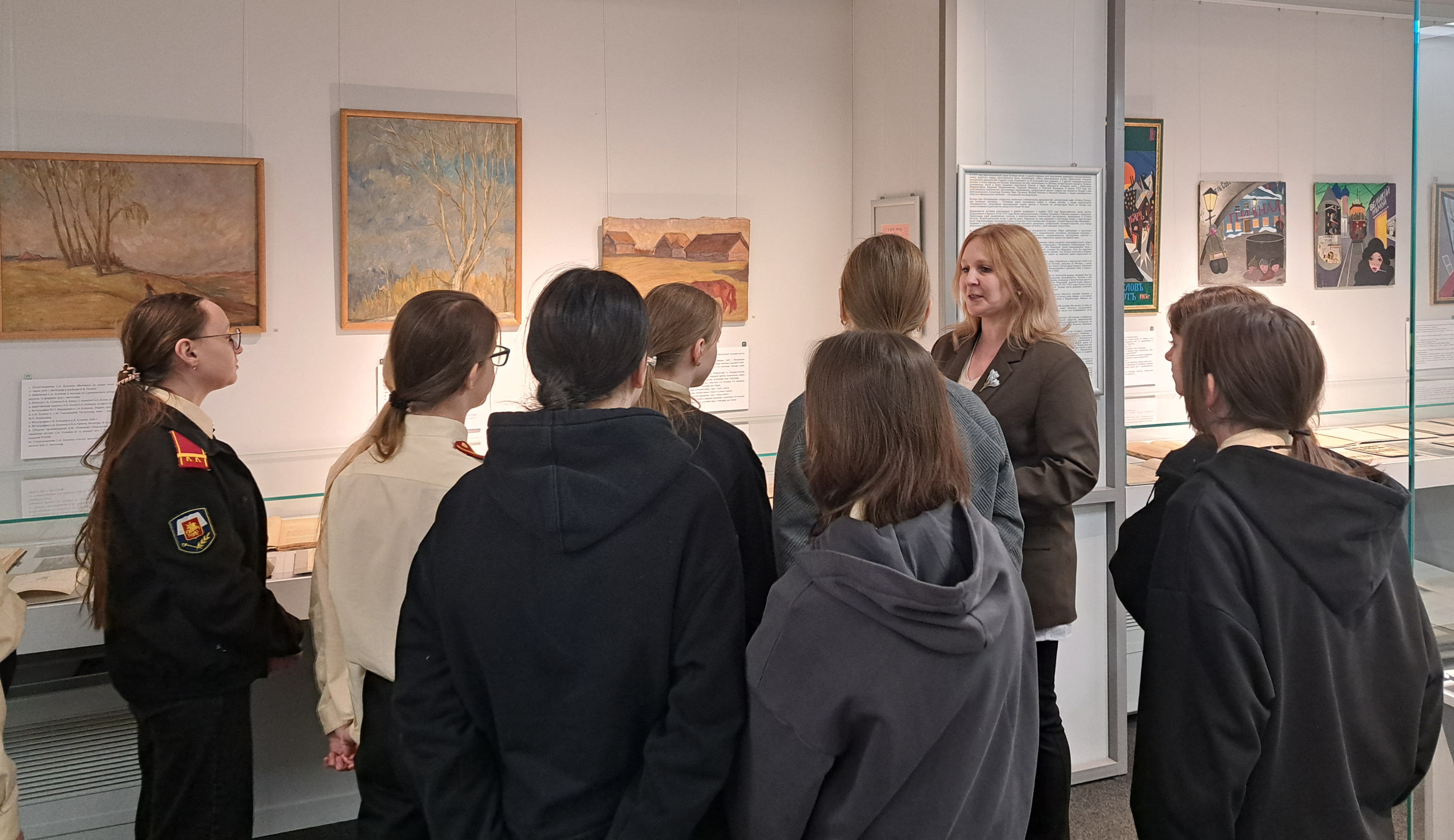 В выставочном зале РГАЛИ начальник отдела ‒ куратор выставки К.В. Яковлева провела тематическую экскурсию по выставке, приуроченной к 130-летию со дня рождения С.А. Есенина. Экспозиция построена на подлинных архивных материалах и призвана продемонстрировать путь С.А. Есенина в литературе, отразив эволюцию его духовных и эстетических поисков, смену настроений, мотивов, муз и главных тем. Положенные в ее основу почти 200 документов из фондов архива позволяют в полной мере реконструировать личную и творческую биографию Сергея Есенина.