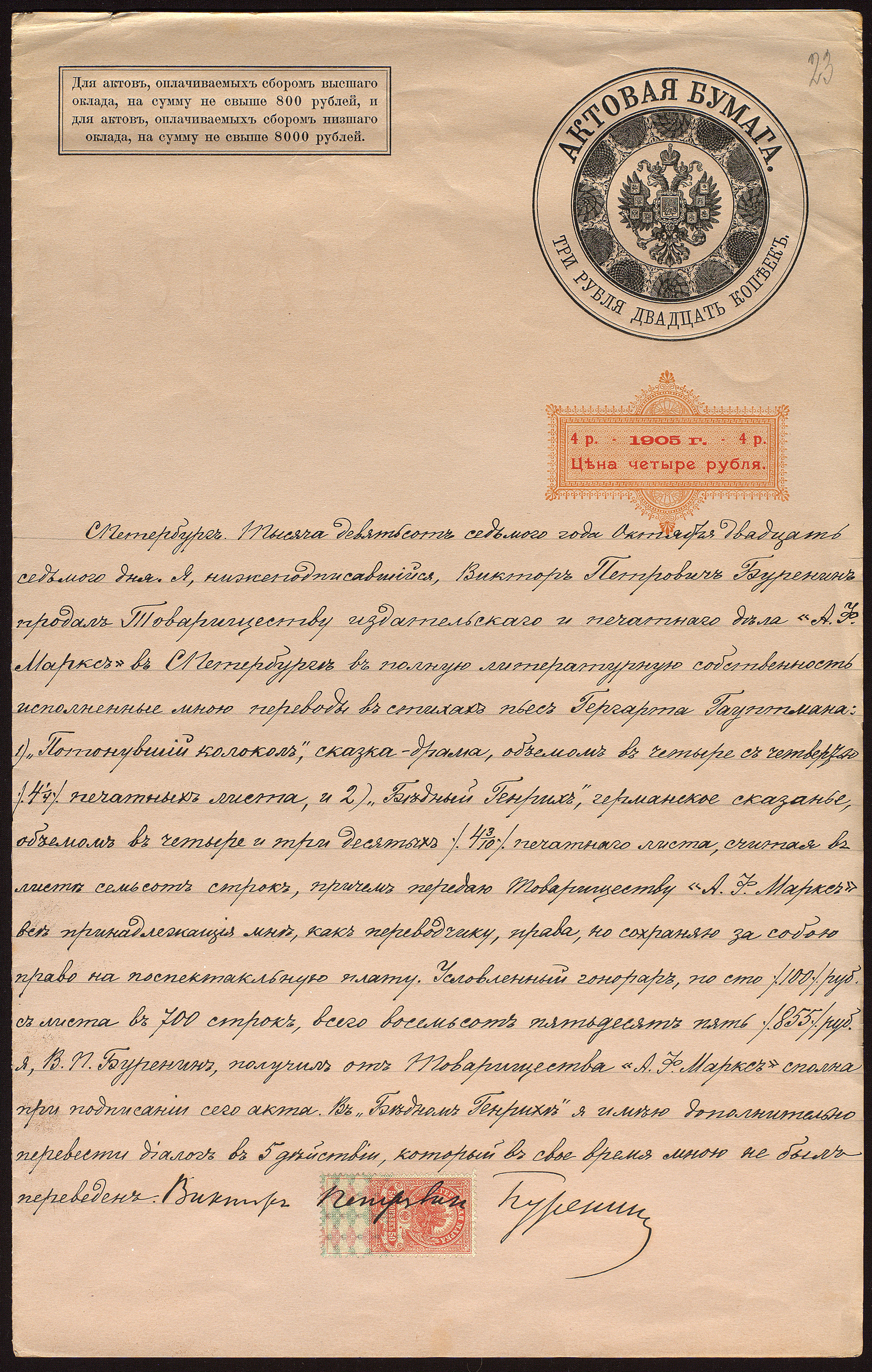 В 1875 году Буренин по приглашению А.С. Суворина перешел в газету «Новое время», сотрудничество с которой не прекращал вплоть до ее закрытия в октябре 1917 года. Историки литературы отмечают, что этот творческий союз произвел настоящую жанровую революцию в отечественной журналистике: фельетон, мастерски освоенный Бурениным еще в начале карьеры, стал в «Новом времени» основной литературной формой и главной «приманкой» для читателей, обеспечившей газете популярность в самых разных политических и социальных слоях.