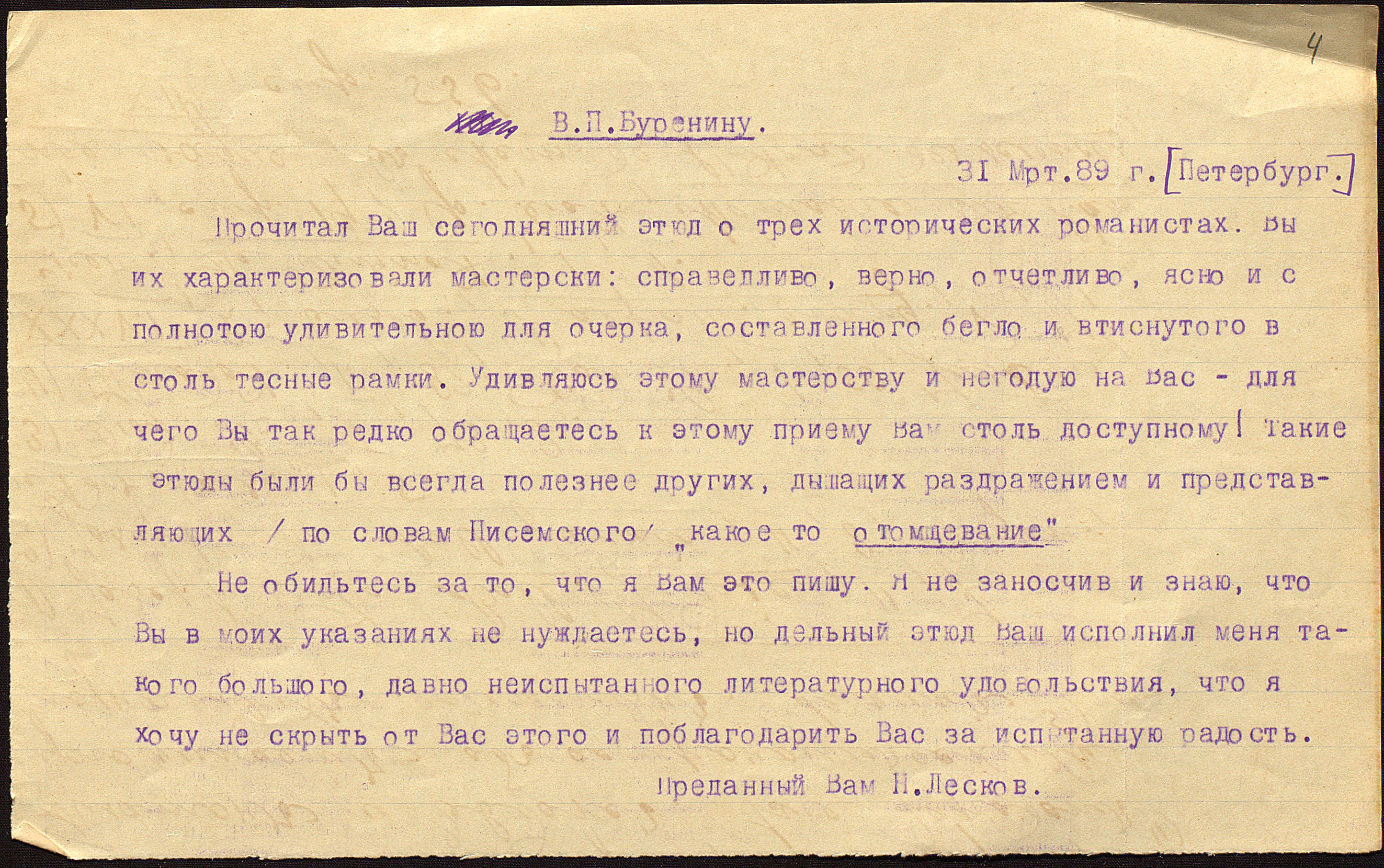 Все эти многочисленные проявления кипучей творческой деятельности неизменно пользовались у читателей популярностью. Особенно привлекали романы и пьесы на современную тематику, схожие с публицистикой автора за счет злободневности и наличия персонажей, в которых легко угадывались реальные прототипы. И все же нет сомнений, что в первую очередь Буренин привлекал как остроумный критик и меткий сатирик, позволявший себе не считаться с чужим мнением: «У Буренина-поэта найдется много соперников, также точно, как у Буренина-драматурга, но в качестве сатирика господин Буренин соперников не имеет» - писал К.П. Медведский ( Ф. 191. Оп. 1. Ед. хр. 666. Л. 45).