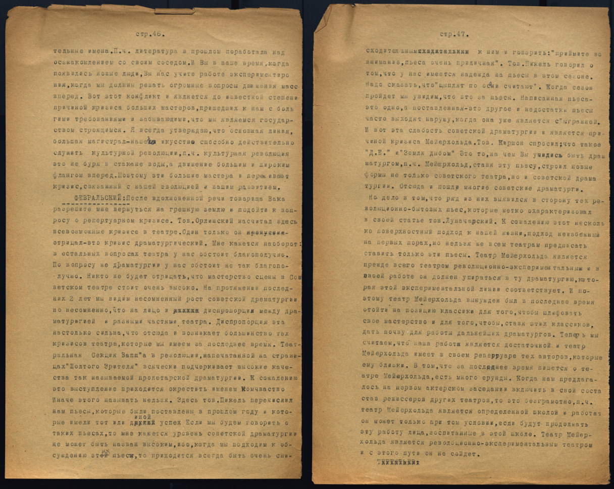 Наконец, фонд включает в себя колоссальный массив собранных Александром Вильямовичем материалов, который сам по себе − бесценный источник по истории театра. Это и служебные записки Мейерхольда, и афиши ГосТИМа, и стенограммы известных творческих диспутов 1920-х годов. Особого внимания заслуживают воспоминания мексиканского художника Диего Риверы о Маяковском, написанные в Боткинской больнице, уникальная подборка фотографий. Снимки запечатлели не только самого Февральского в окружении В.И. Немировича-Данченко, артистов ГосТИМа и грузинских деятелей культуры, но и сцены из спектаклей Театра имени Шота Руставели, кадры из фильмов 1920–1930-х годов, что делает это собрание энциклопедией истории советского театра.