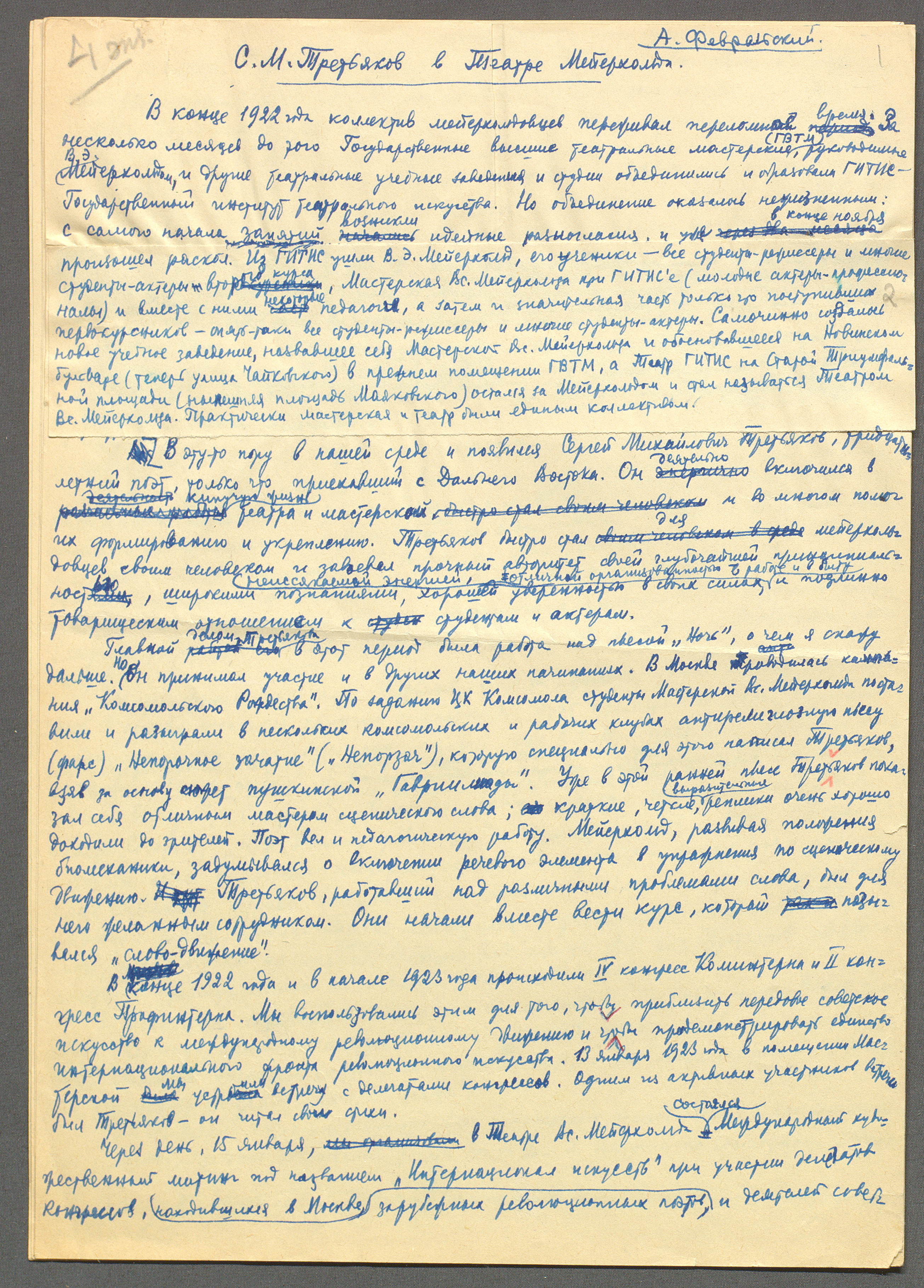 Основу фонда составляют рукописи Февральского, охватывающие без малого семь десятилетий научной и критической работы. Здесь и ранние статьи о московских театрах, и уникальные записи занятий К.С. Станиславского, и, конечно же, фундаментальные труды о В.Э. Мейерхольде и В.В. Маяковском. Особую ценность представляют документы с правкой самого Мейерхольда, верстки собраний сочинений Маяковского с редакторской правкой Февральского, а также его глубокие исследования грузинского и испанского театров, включая кандидатскую диссертацию о новейшей испанской драматургии и совместные с Ф.В. Кельниным переводы пьес Федерико Гарсиа Лорки.