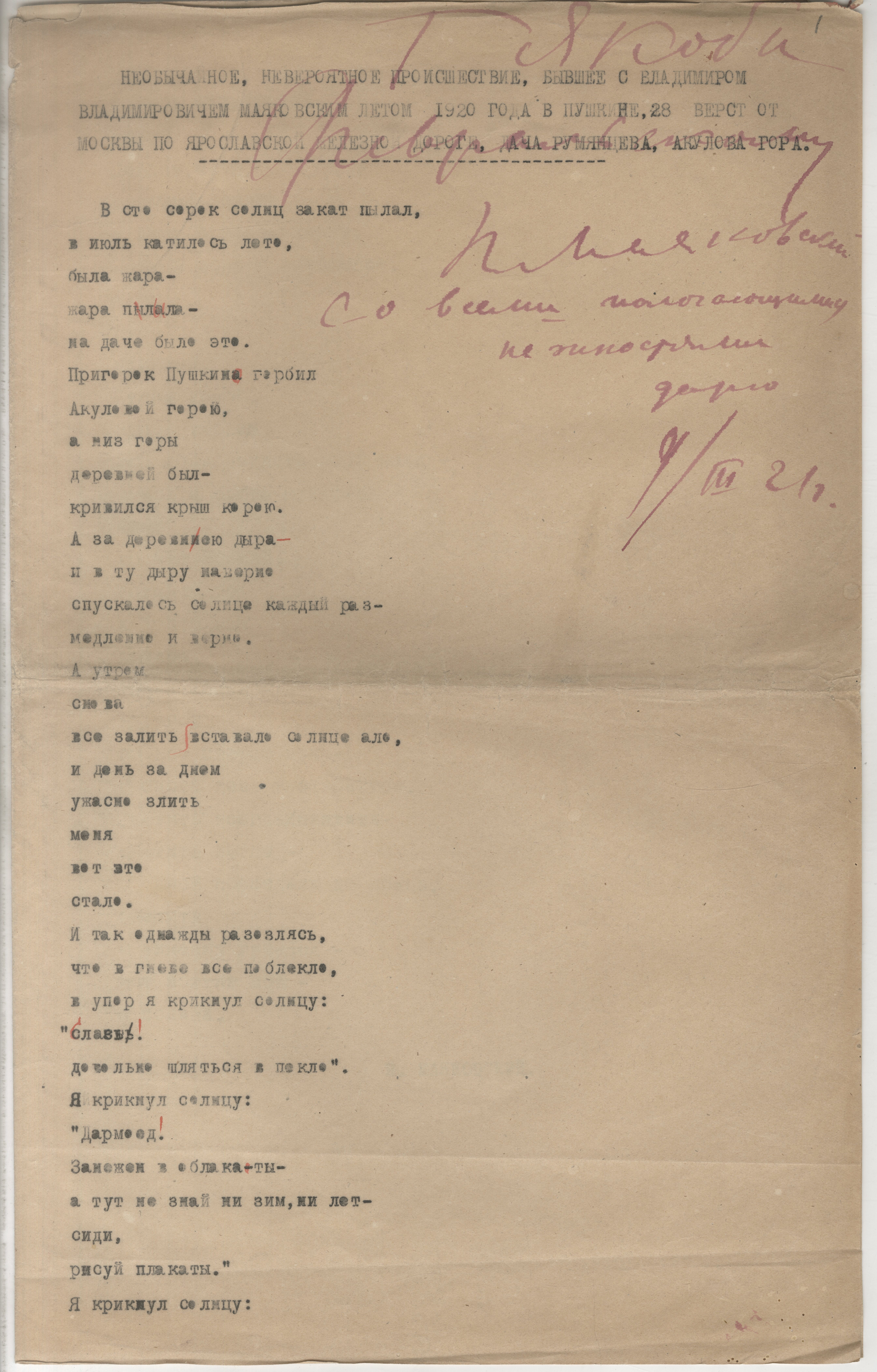 Помимо Мейерхольда, Александр Вильямович близко знал и Владимира Маяковского. Поэту он посвятил две свои книги: «Маяковский − драматург» (1940) и много позже − «Встречи с Маяковским» (1971). В личном архиве театроведа сохранилась бесценная реликвия той эпохи: машинописный экземпляр стихотворения «Необычайное приключение, бывшее с Владимиром Маяковским летом на даче» с дарственной надписью самого поэта (РГАЛИ, Ф. 2437, Оп. 1). Позднее Александр Вильямович работал и с другими материалами: в его бумагах можно найти записи занятий Станиславского, конспекты лекций Немировича-Данченко и др., поскольку убежденный в необходимости сохранить театральное наследие, он бережно фиксировал каждую деталь уходящего времени.