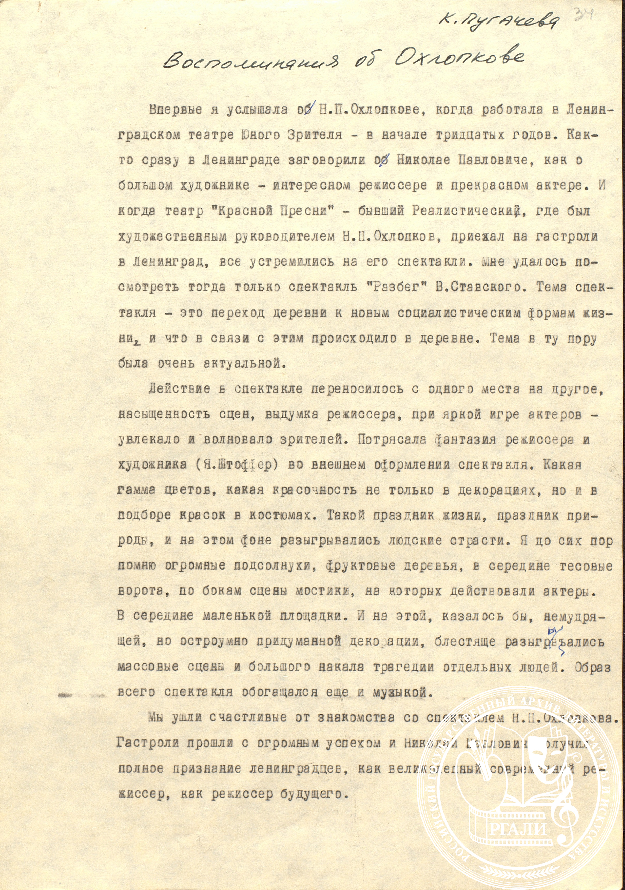 В театре царила творческая атмосфера, а его создатель А.А. Брянцев привлекал к работе самых именитых детских писателей. По четвергам, сразу после окончания спектакля, в ТЮЗе собирались Самуил Маршак, Александра Бруштейн, Евгений Шварц, Борис Житков и другие авторы, проходили читки, шло обсуждение планов театра, устраивались шутливые конкурсы. Поклонники (а среди них были такие непохожие друг на друга люди, как Аркадий Райкин и Даниил Хармс, Лев Ландау и Владимир Маяковский) буквально носили Каплю, или Капу, как К.В. Пугачеву звали с детства, от ТЮЗа до дома на руках. Дружбу со многими известными писателями, актерами, режиссерами, учеными Клавдия Пугачева – обаятельная, душевно щедрая и умевшая дружить – пронесла через всю жизнь. И лучшие свидетельства тому – ее переписка и живые воспоминания, сохранившиеся в ее архивном фонде в РГАЛИ.